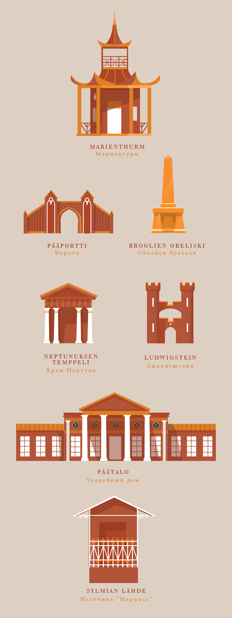 IllustrationSome of the park Monrepos’ sights as icons for an application done for Finnish Museum of Architecture’s coming exhibition about parks.